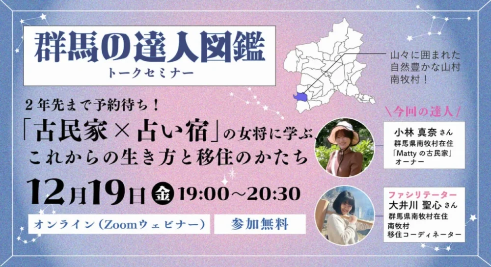 お知らせ 12/19(金)19:00~ オンラインセミナー 「古民家×占いの宿」の女将に学ぶ、これらからの生き方と移住のかたち